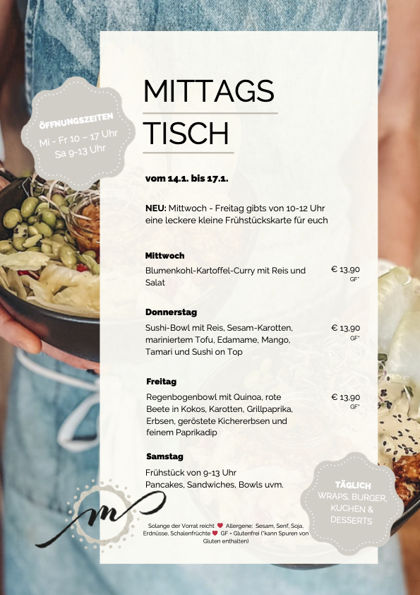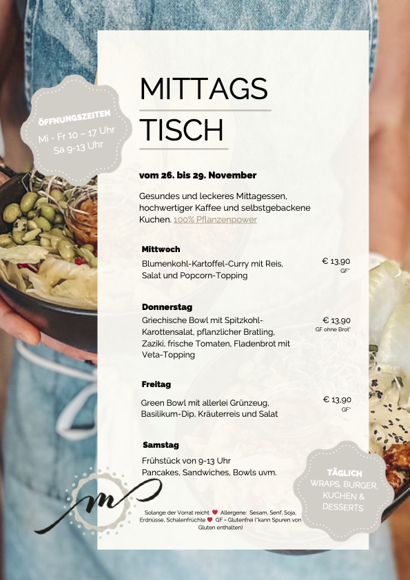 Was es hier bei uns im Café gibt, das kommt fast direkt aus der Erde – plant based! Kreativ und achtsam verarbeiten und bereiten wir für dich diese Nahrungsmittel zu unseren Nice-Products. Nett anzusehen, natürlich geschmackvoll, mit vielen wertvollen Essenzen und ohne chemische Zusatzstoffe oder Geschmacksverstärker. Ein Mandala des Geschmacks. Hier bei uns oder natürlich auch zum Mitnehmen – taste it!