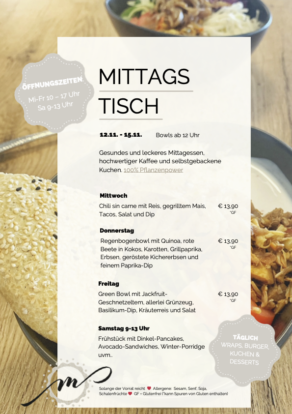 Was es hier bei uns im Café gibt, das kommt fast direkt aus der Erde – plant based! Kreativ und achtsam verarbeiten und bereiten wir für dich diese Nahrungsmittel zu unseren Nice-Products. Nett anzusehen, natürlich geschmackvoll, mit vielen wertvollen Essenzen und ohne chemische Zusatzstoffe oder Geschmacksverstärker. Ein Mandala des Geschmacks. Hier bei uns oder natürlich auch zum Mitnehmen – taste it!