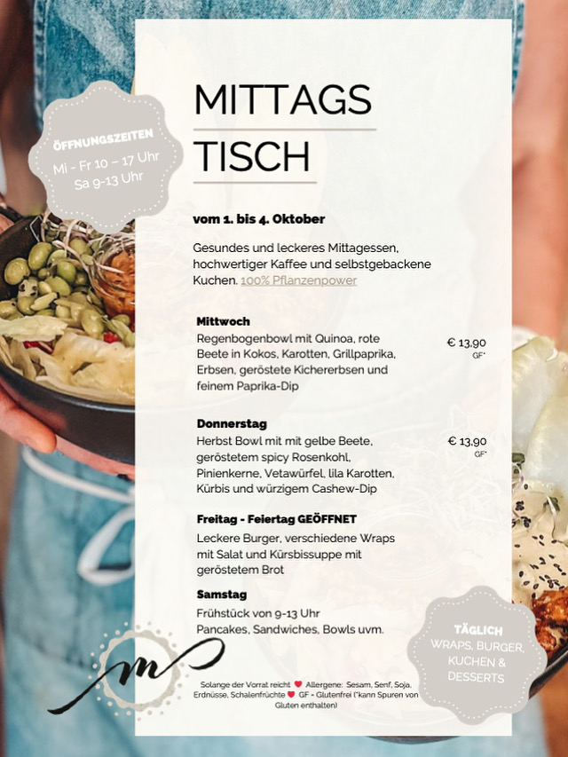 Was es hier bei uns im Café gibt, das kommt fast direkt aus der Erde – plant based! Kreativ und achtsam verarbeiten und bereiten wir für dich diese Nahrungsmittel zu unseren Nice-Products. Nett anzusehen, natürlich geschmackvoll, mit vielen wertvollen Essenzen und ohne chemische Zusatzstoffe oder Geschmacksverstärker. Ein Mandala des Geschmacks. Hier bei uns oder natürlich auch zum Mitnehmen – taste it!
